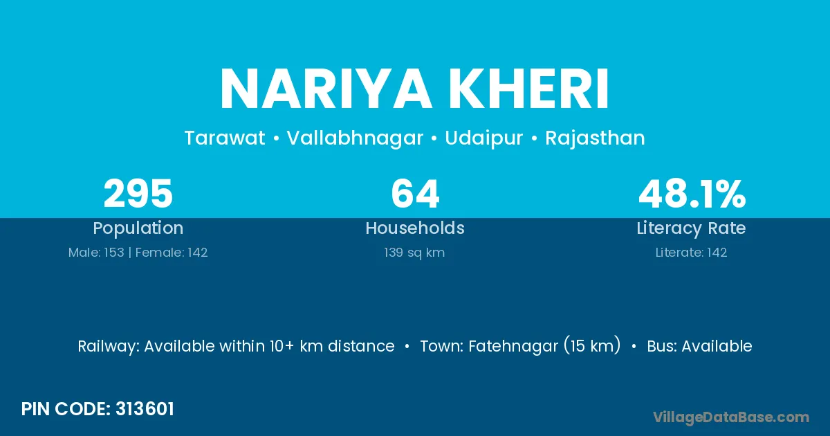 Fatehnagar (15 km) is the nearest town to Nariya Kheri village for major economic activities and is located approximately 15 km away.