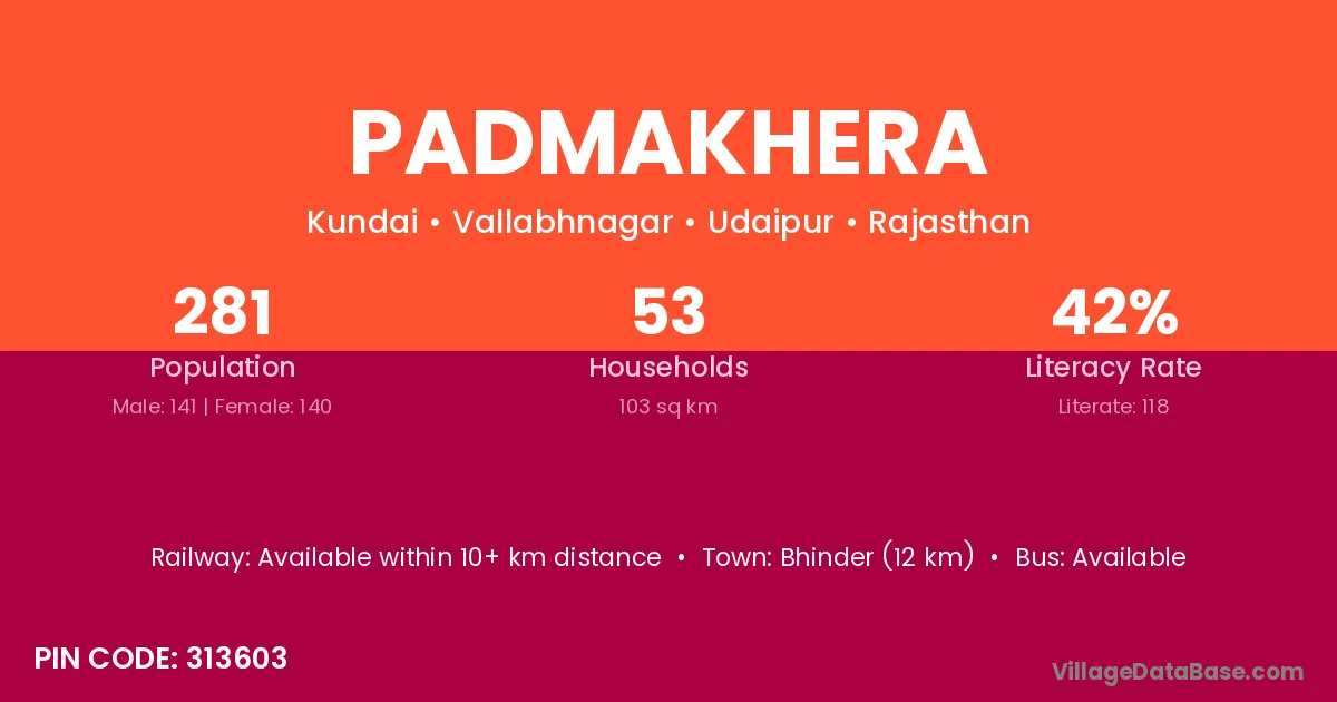 Padmakhera village has a total population of 281 people, of which 141 are males and 140 are females.