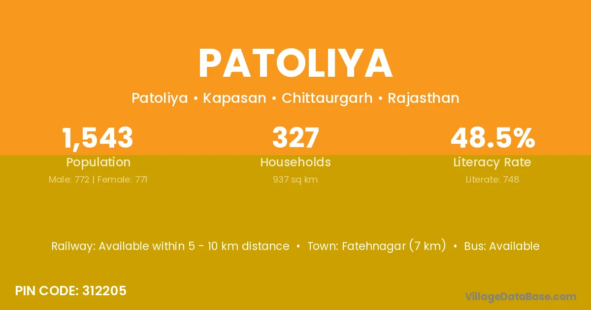 Udaipur (42 km) is the nearest town to Patoliya village for major economic activities and is located approximately 42 km away.