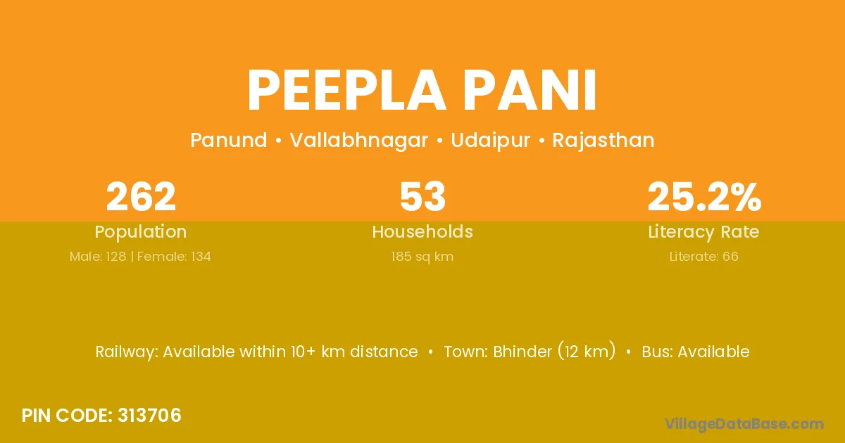 Peepla Pani village has a total population of 262 people, of which 128 are males and 134 are females.