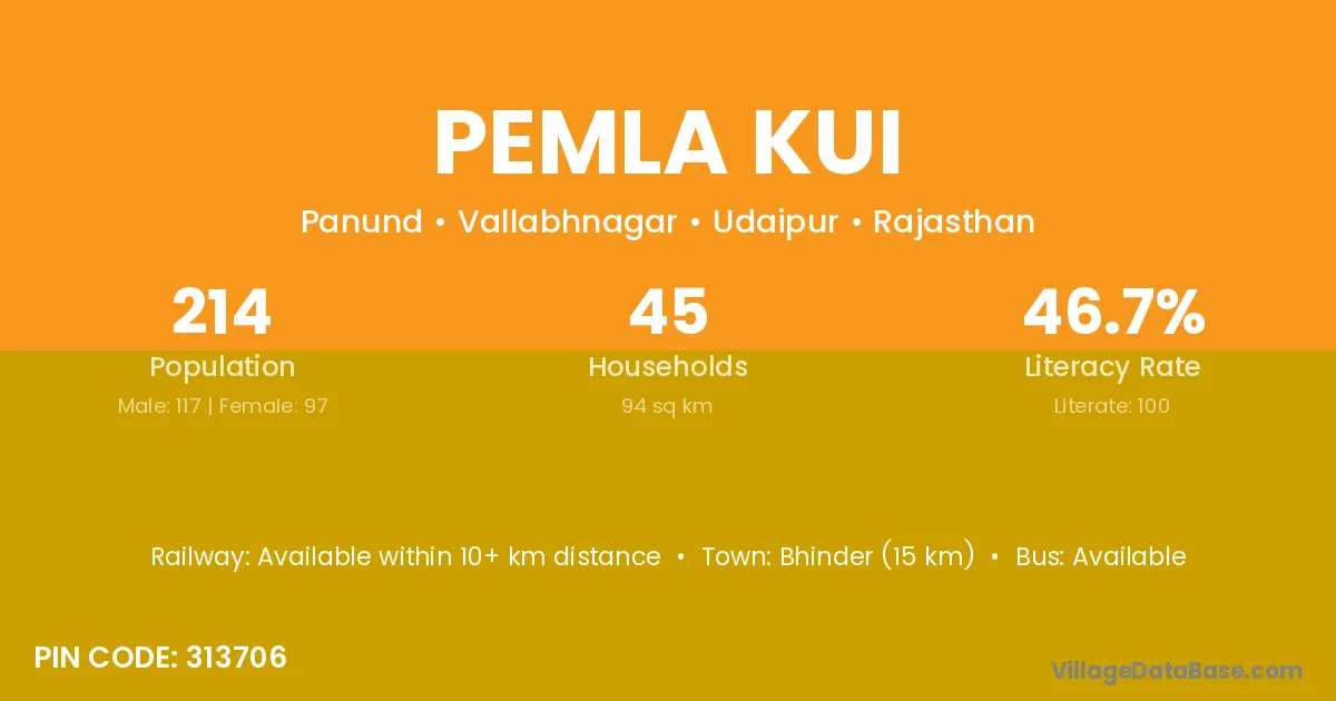 Bhinder (15 km) is the nearest town to Pemla Kui village for major economic activities and is located approximately 15 km away.
