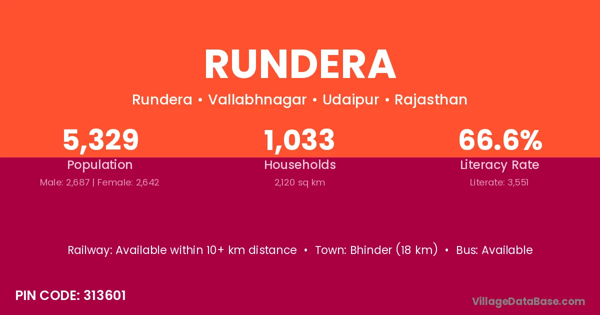 Rundera village has a total population of 5,329 people, of which 2,687 are males and 2,642 are females.