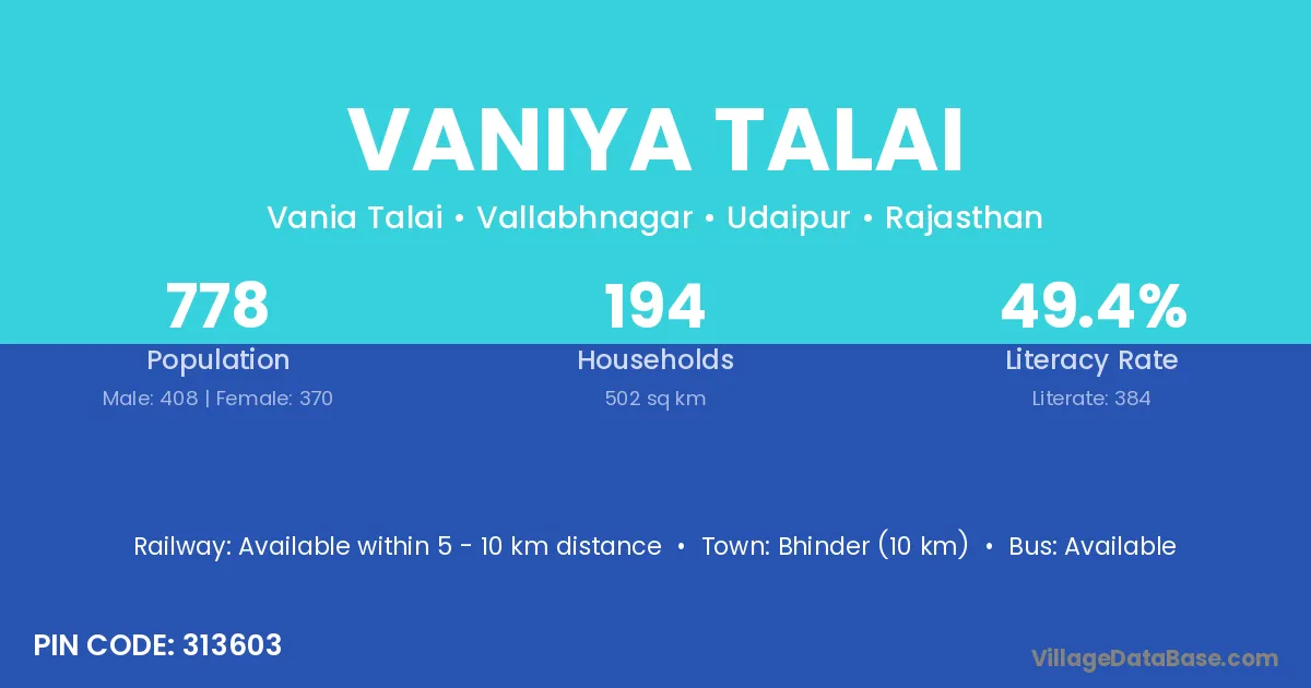 Vaniya Talai village has a total population of 778 people, of which 408 are males and 370 are females.