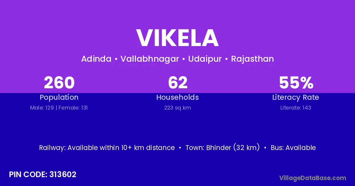 Bhinder (32 km) is the nearest town to Vikela village for major economic activities and is located approximately 32 km away.