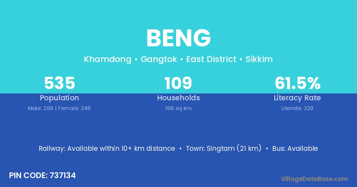 Singtam (21 km) is the nearest town to Beng village for major economic activities and is located approximately 21 km away.