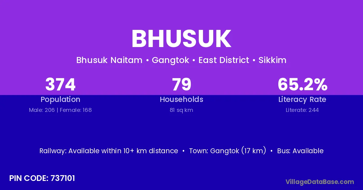 Gangtok (17 km) is the nearest town to Bhusuk village for major economic activities and is located approximately 17 km away.