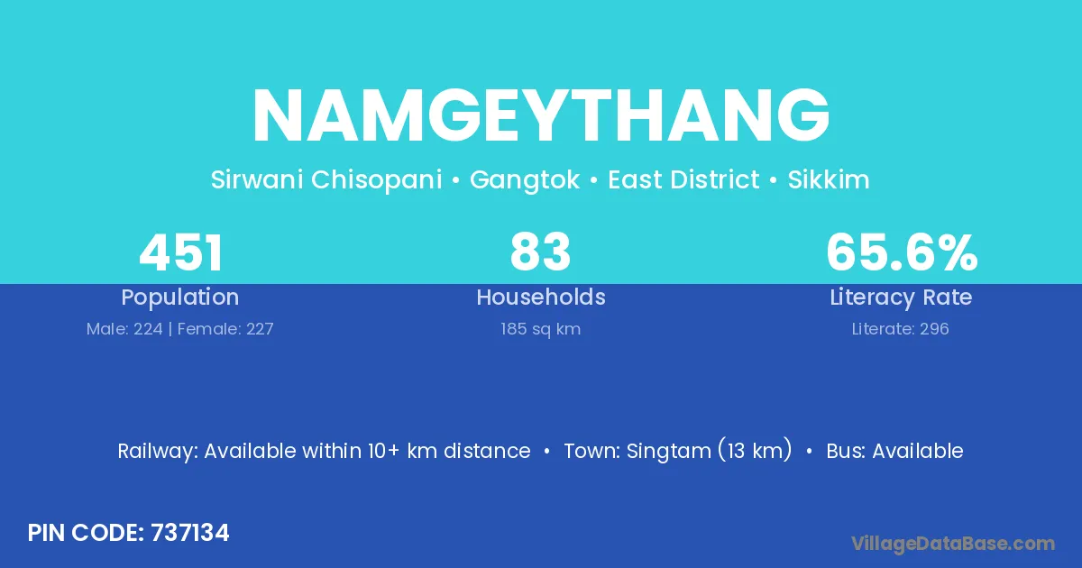 Namgeythang village has a total population of 451 people, of which 224 are males and 227 are females.