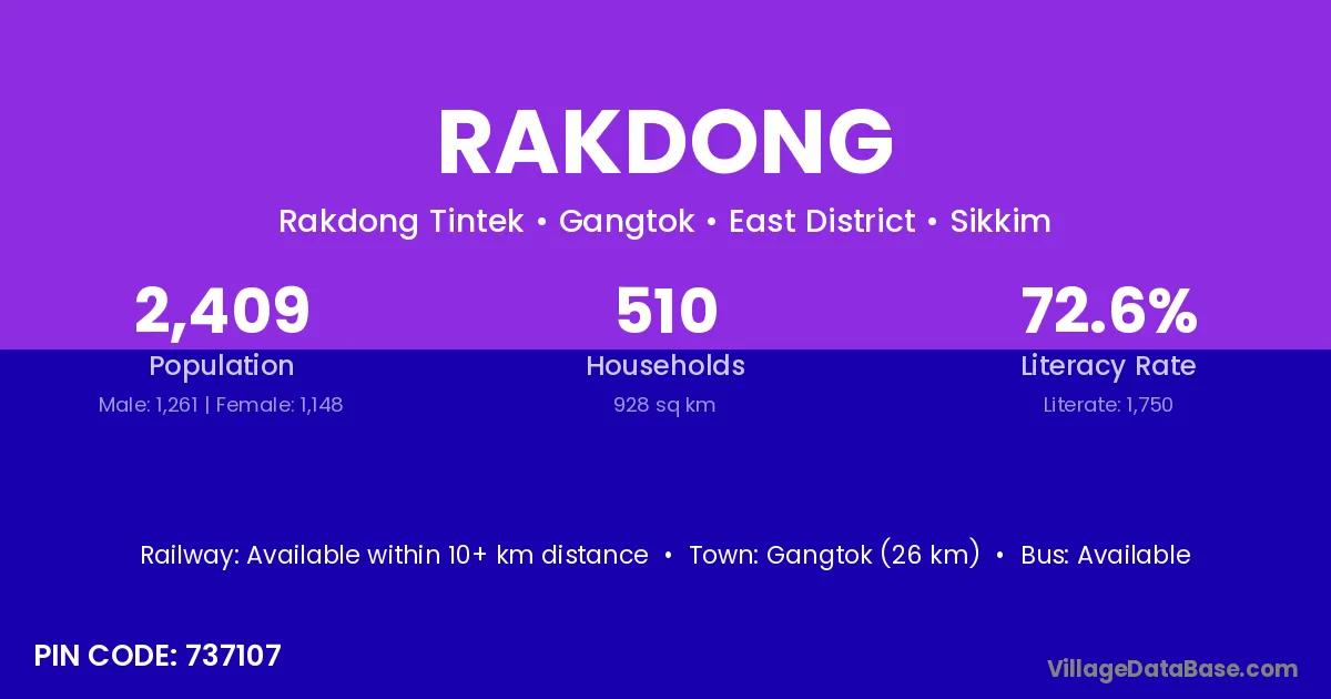 Gangtok (26 km) is the nearest town to Rakdong village for major economic activities and is located approximately 26 km away.