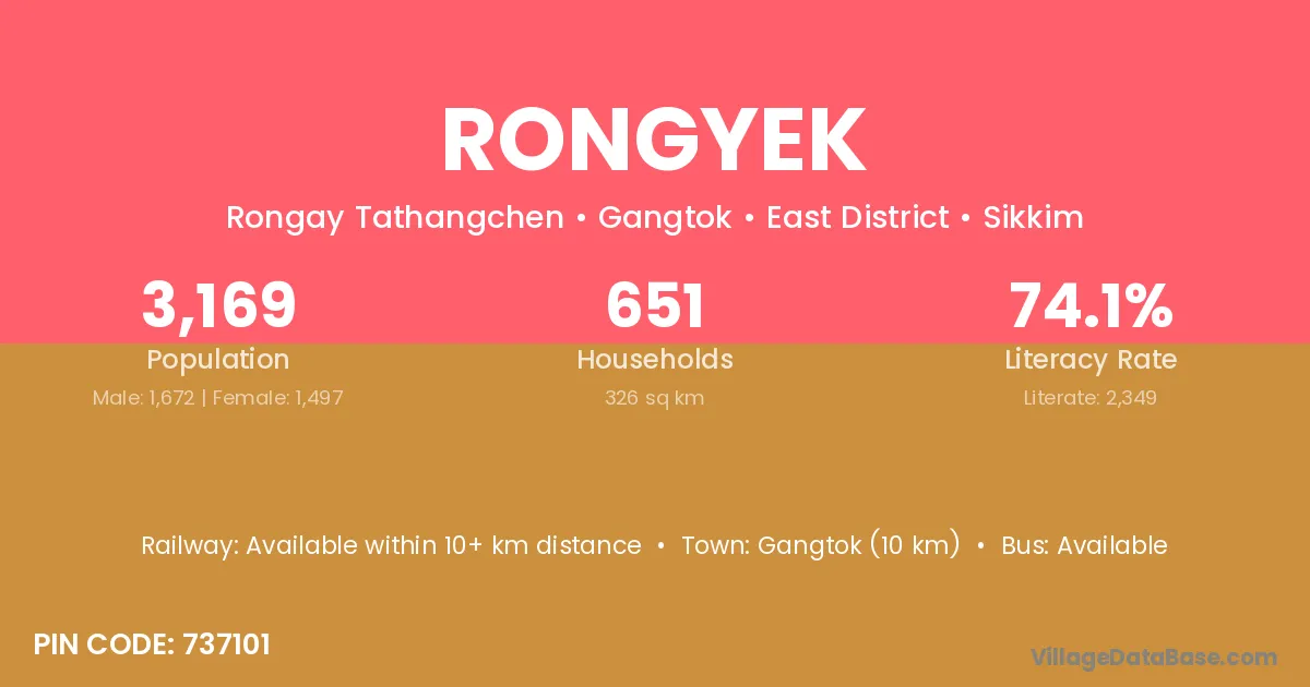 Gangtok (10 km) is the nearest town to Rongyek village for major economic activities and is located approximately 10 km away.