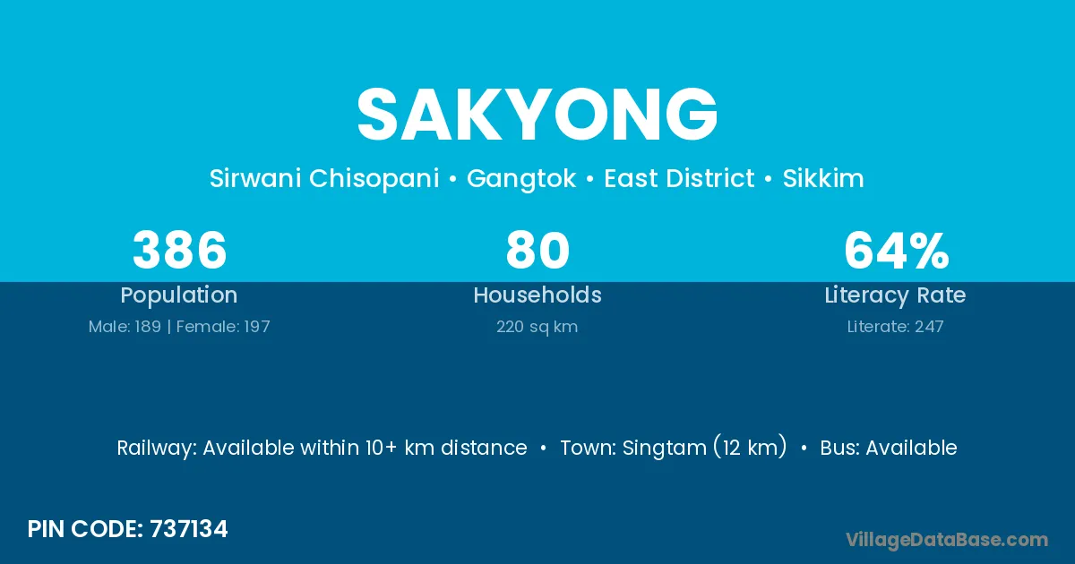 Sakyong village has a total population of 386 people, of which 189 are males and 197 are females.