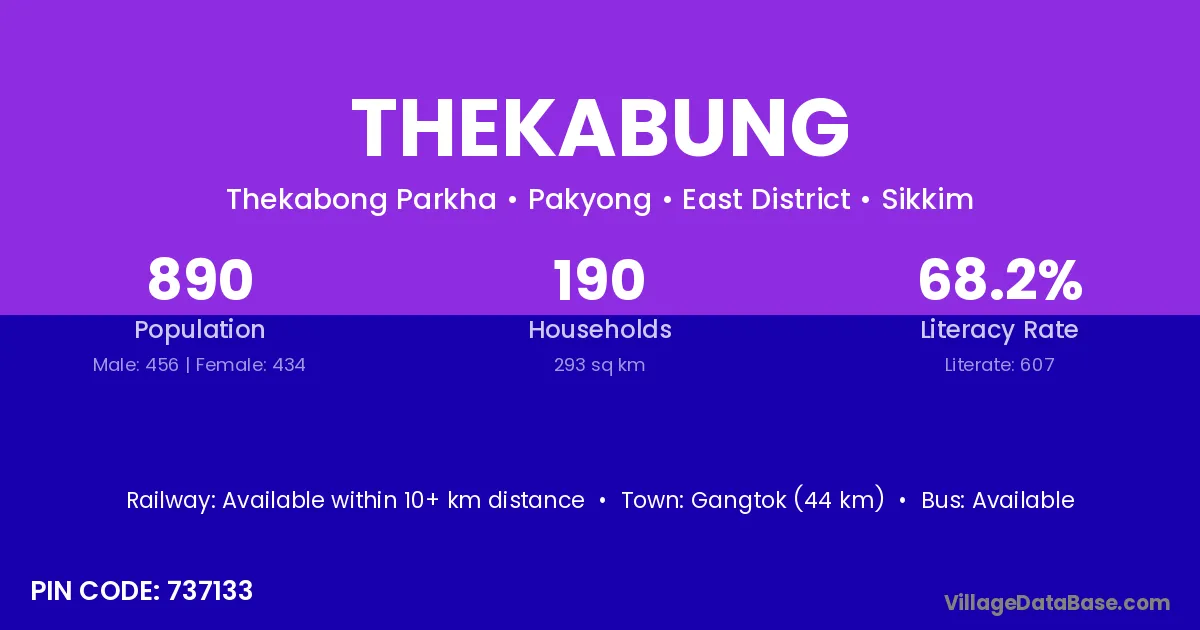 Gangtok (44 km) is the nearest town to Thekabung village for major economic activities and is located approximately 44 km away.