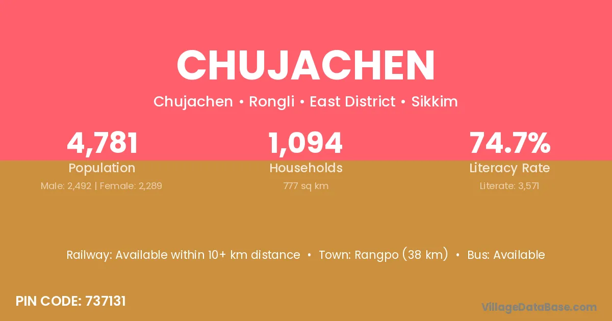 Rangpo (38 km) is the nearest town to Chujachen village for major economic activities and is located approximately 38 km away.