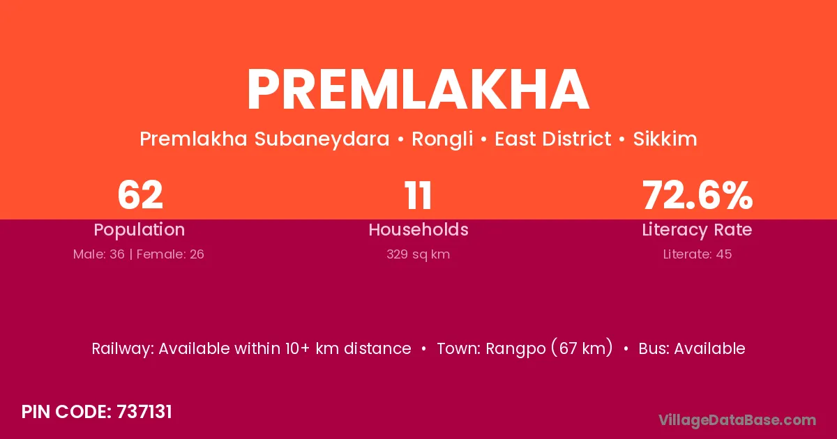 Rangpo (67 km) is the nearest town to Premlakha village for major economic activities and is located approximately 67 km away.
