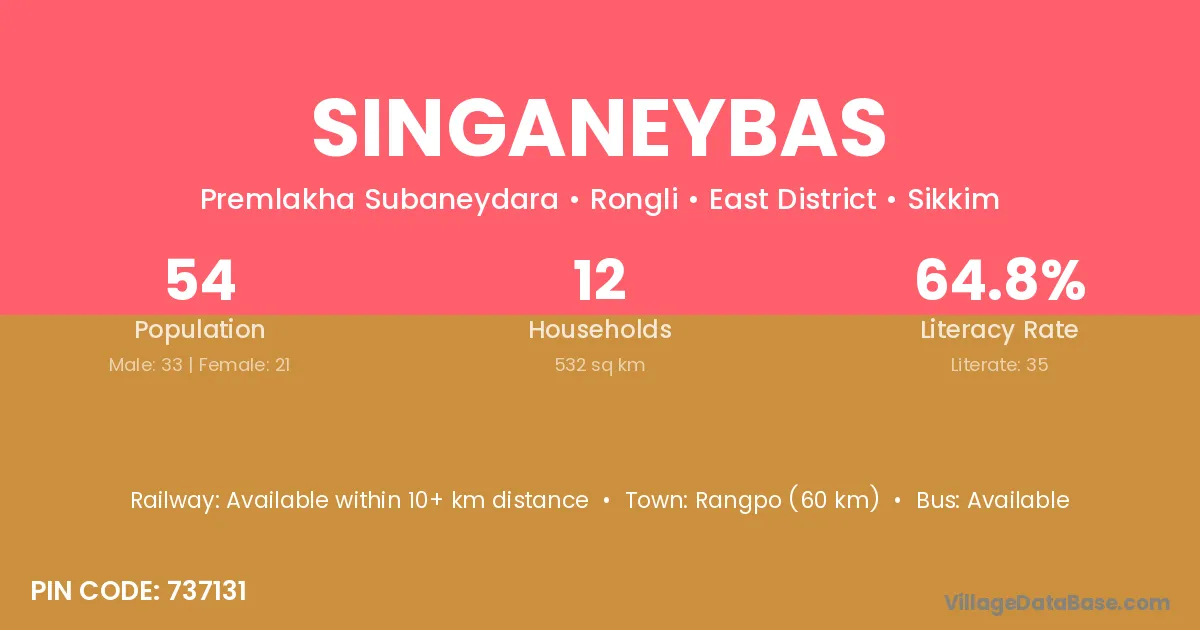 Rangpo (60 km) is the nearest town to Singaneybas village for major economic activities and is located approximately 60 km away.