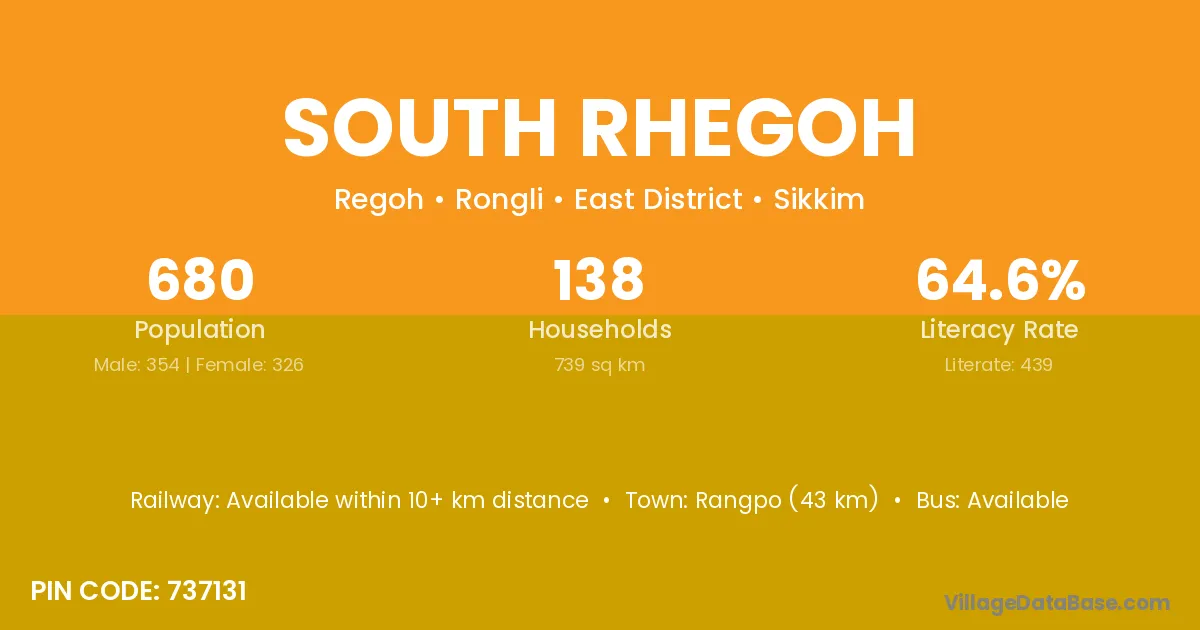 Rangpo (43 km) is the nearest town to South Rhegoh village for major economic activities and is located approximately 43 km away.