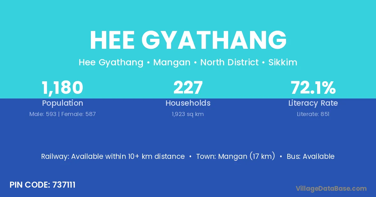 Hee Gyathang village has a total population of 1,180 people, of which 593 are males and 587 are females.