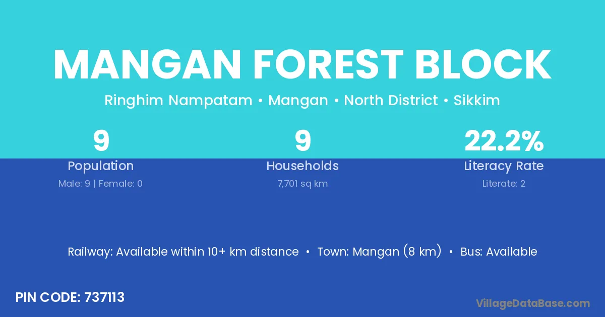 The literacy rate of Mangan Forest Block village is 22.22%. Male literacy stands at 22.22% and female literacy at 0%.