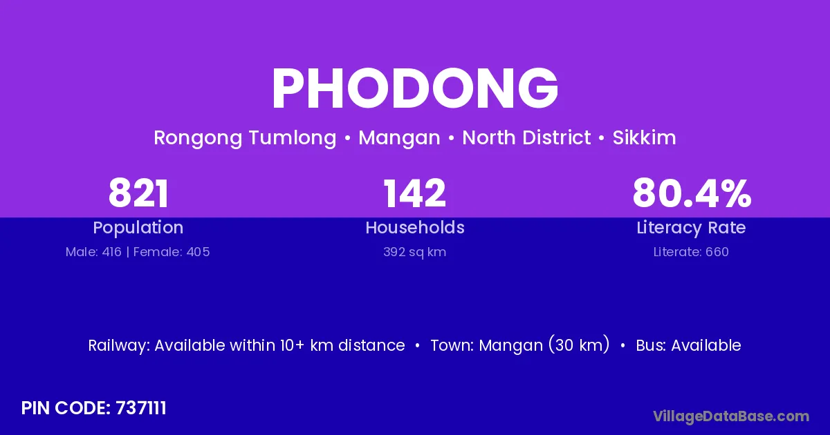 Mangan (30 km) is the nearest town to Phodong village for major economic activities and is located approximately 30 km away.
