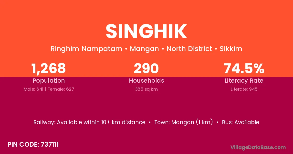 Mangan (1 km) is the nearest town to Singhik village for major economic activities and is located approximately 1 km away.