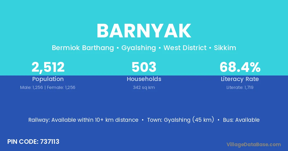 Singtam (16 km) is the nearest town to Barnyak village for major economic activities and is located approximately 16 km away.