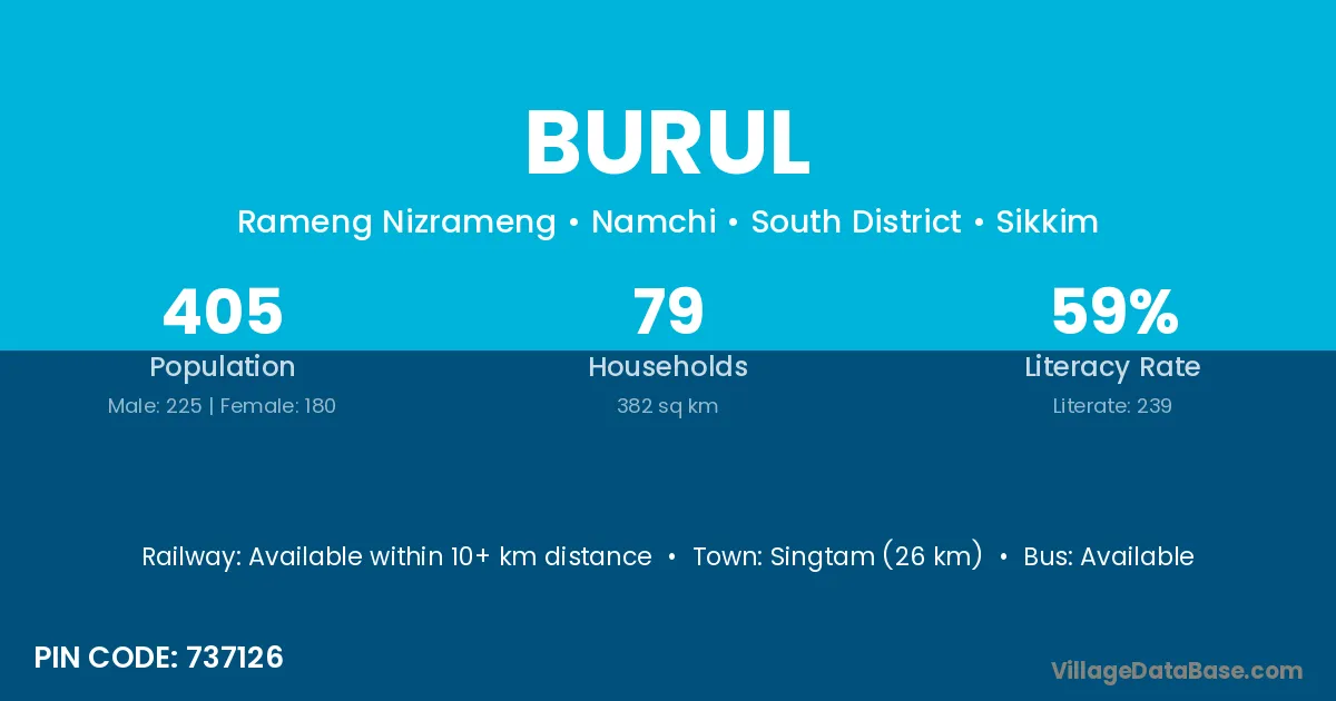 Singtam (26 km) is the nearest town to Burul village for major economic activities and is located approximately 26 km away.