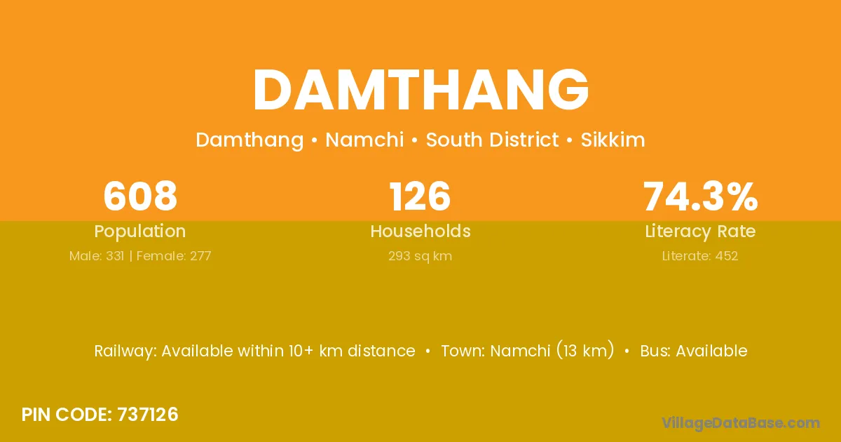 Namchi (13 km) is the nearest town to Damthang village for major economic activities and is located approximately 13 km away.