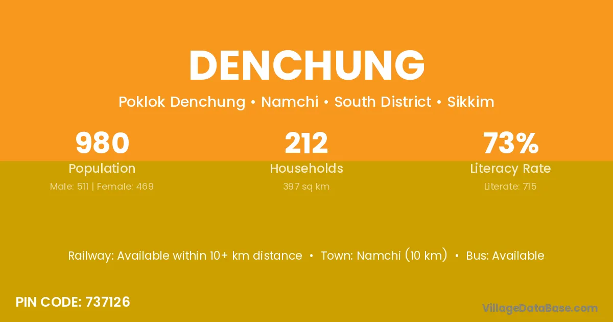Denchung village has a total population of 980 people, of which 511 are males and 469 are females.