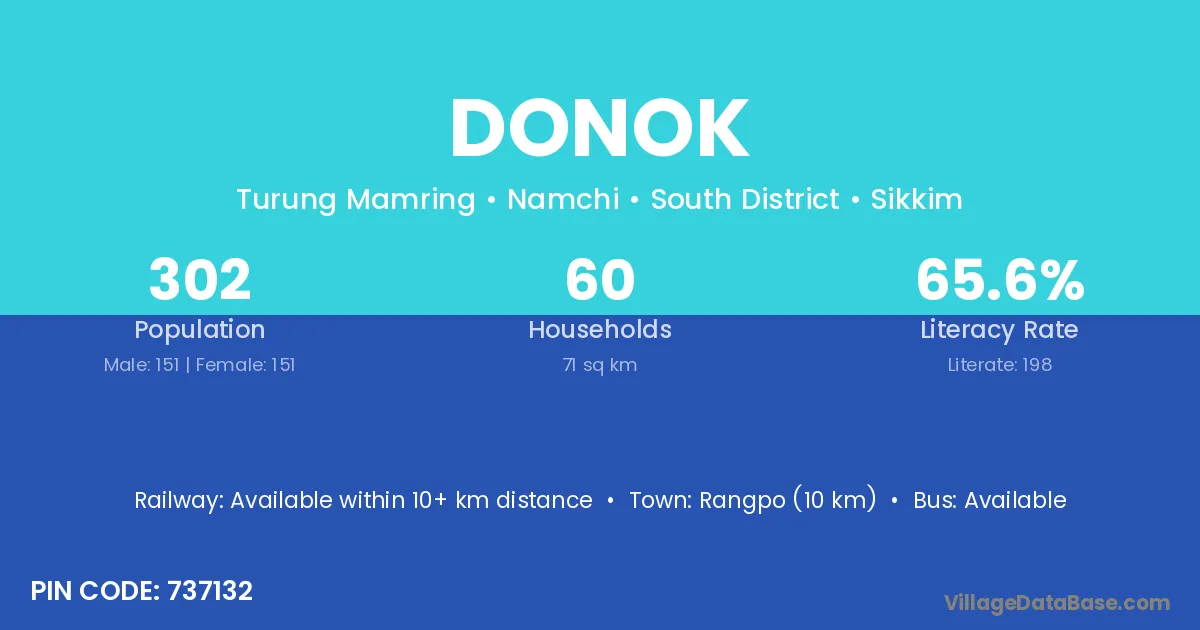 Donok village has a total population of 302 people, of which 151 are males and 151 are females.