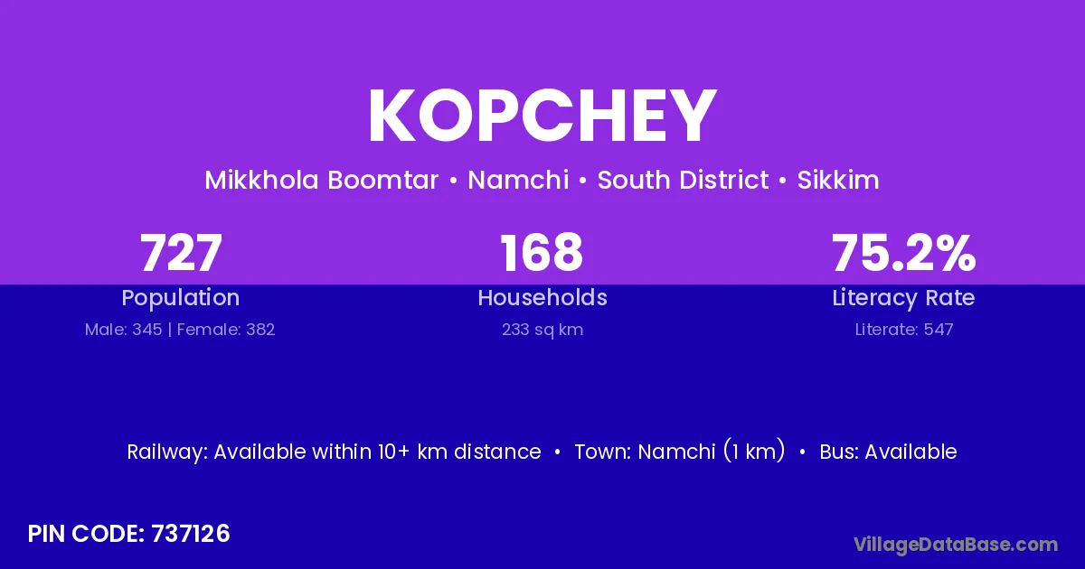 Namchi (1 km) is the nearest town to Kopchey village for major economic activities and is located approximately 1 km away.