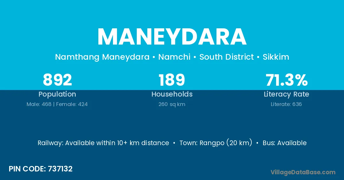 Rangpo (20 km) is the nearest town to Maneydara village for major economic activities and is located approximately 20 km away.