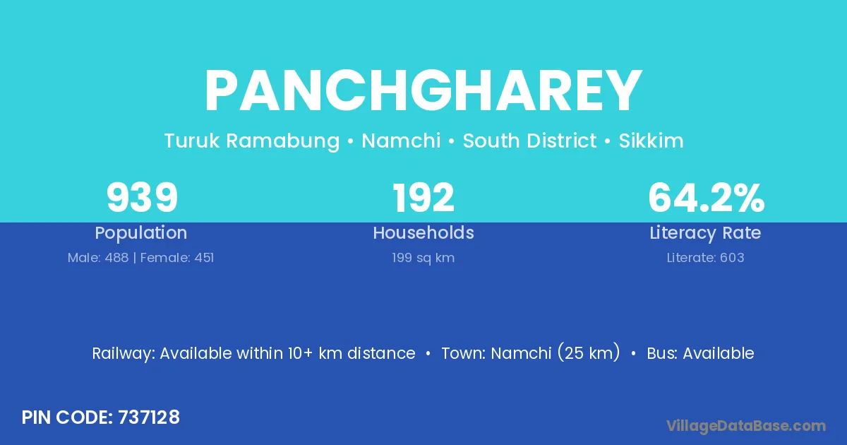 Namchi (25 km) is the nearest town to Panchgharey village for major economic activities and is located approximately 25 km away.