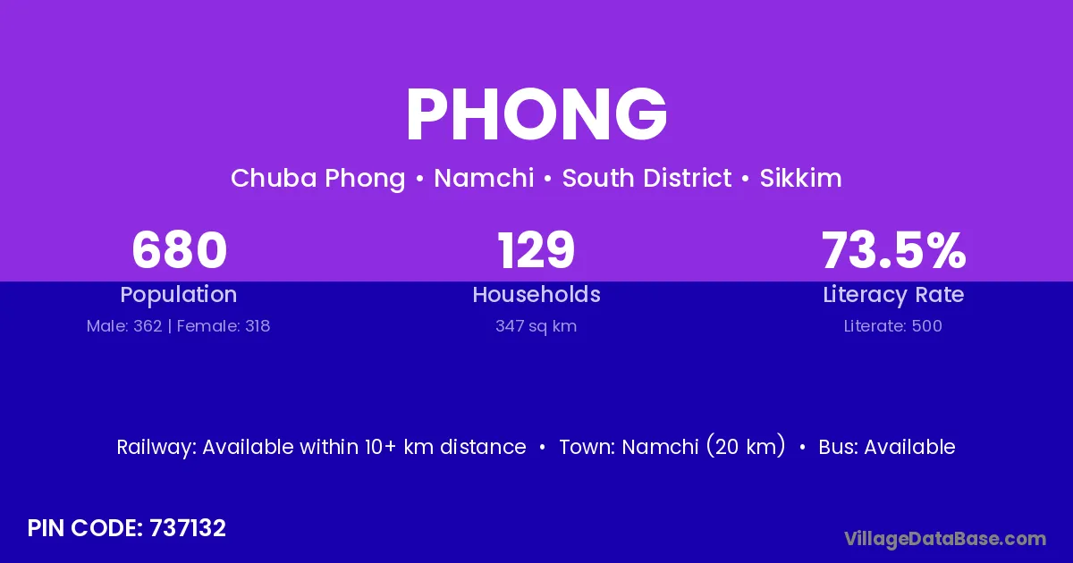 Namchi (20 km) is the nearest town to Phong village for major economic activities and is located approximately 20 km away.