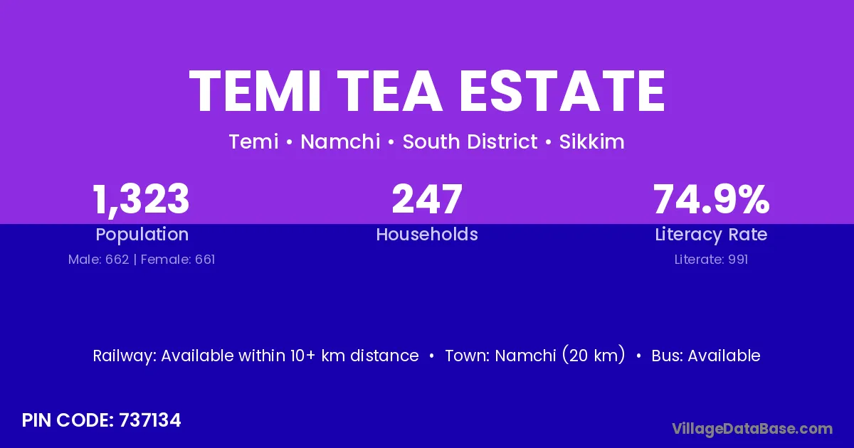 Temi Tea Estate village has a total population of 1,323 people, of which 662 are males and 661 are females.