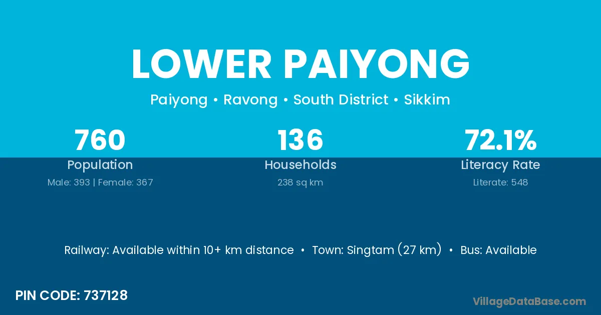 Singtam (27 km) is the nearest town to Lower Paiyong village for major economic activities and is located approximately 27 km away.