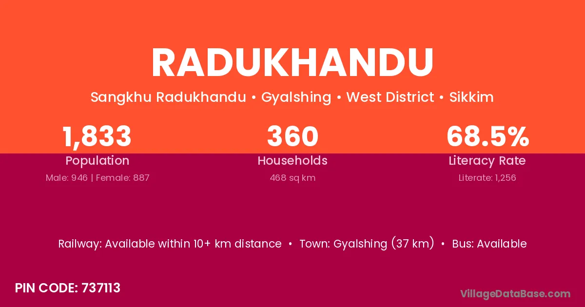 Gyalshing (37 km) is the nearest town to Radukhandu village for major economic activities and is located approximately 37 km away.
