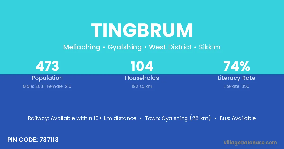 Gyalshing (25 km) is the nearest town to Tingbrum village for major economic activities and is located approximately 25 km away.