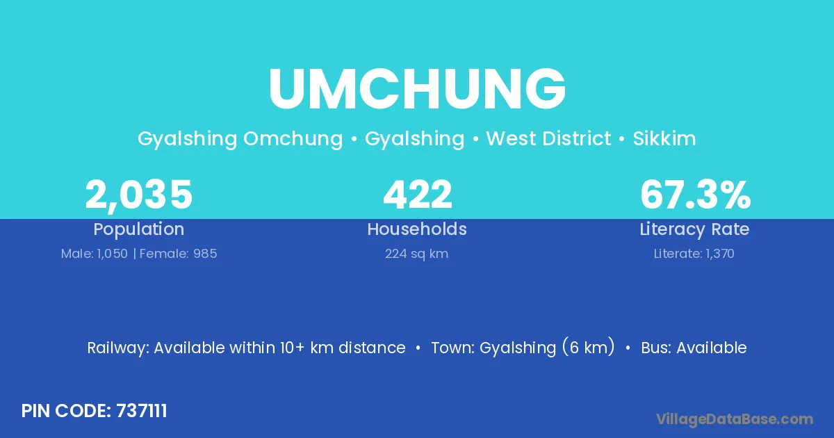 Gyalshing (6 km) is the nearest town to Umchung village for major economic activities and is located approximately 6 km away.