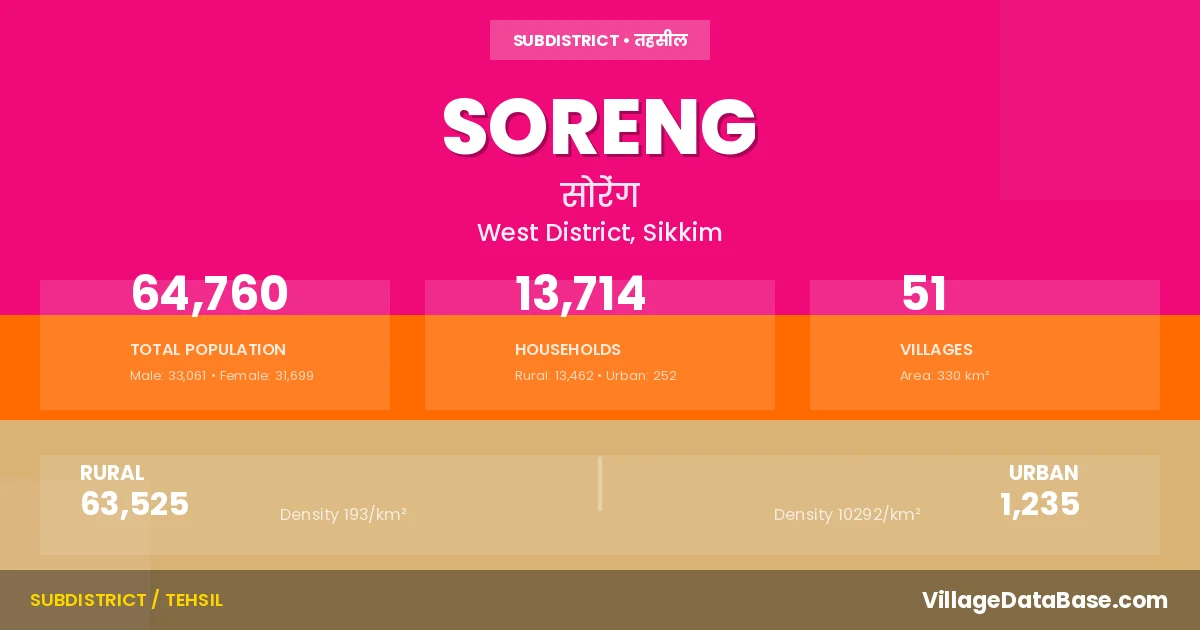 According to the 2011 census The total area of Soreng Subdivision is 330 km², with a population of 64760 people. The population density is 196 inhabitants per square kilometre, and there are approximately 13714 houses in the sub district.