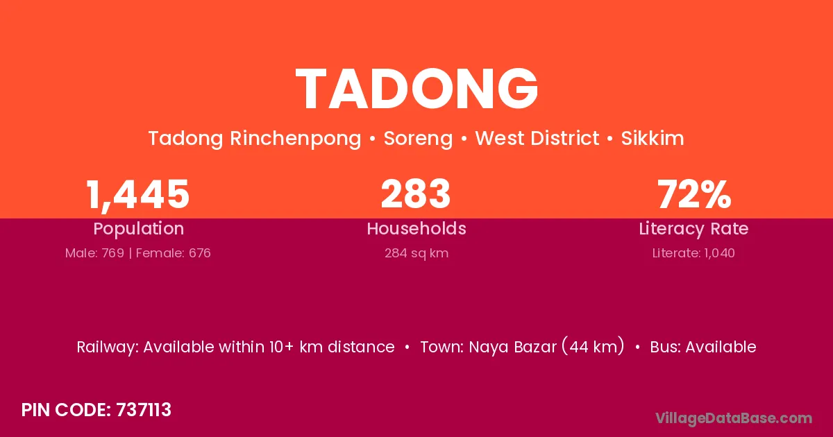 Naya Bazar (44 km) is the nearest town to Tadong village for major economic activities and is located approximately 44 km away.