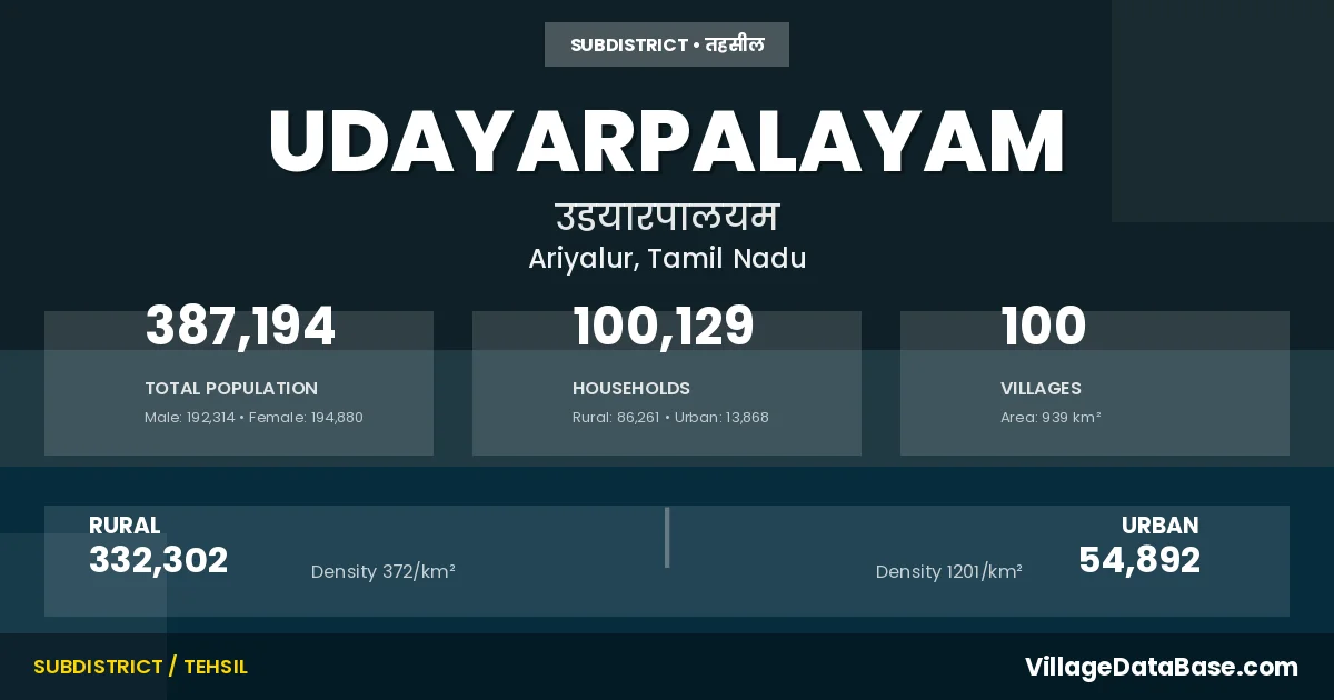 According to the 2011 census The total area of Udayarpalayam Taluka is 939 km², with a population of 387194 people. The population density is 412 inhabitants per square kilometre, and there are approximately 100129 houses in the sub district.