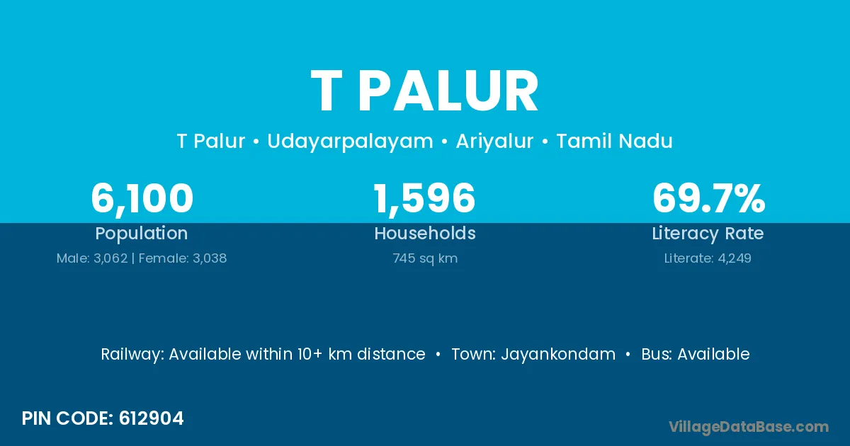 T Palur village has a total population of 6,100 people, of which 3,062 are males and 3,038 are females.