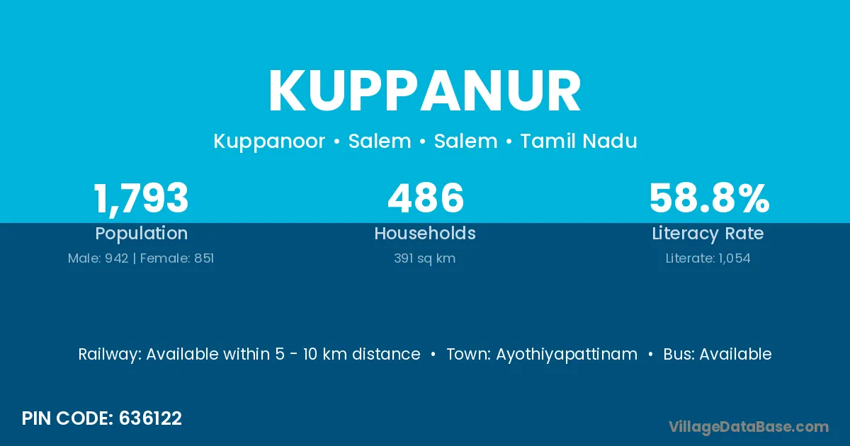 Kuppanur village has a total population of 4,130 people, of which 2,113 are males and 2,017 are females.