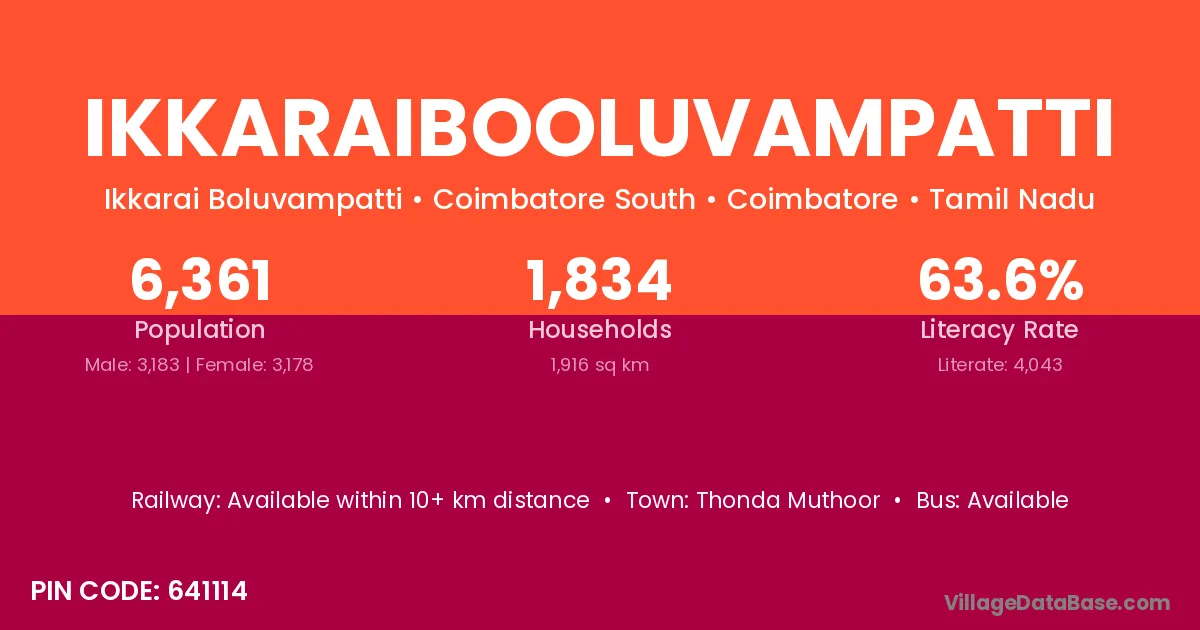 Ikkaraibooluvampatti village has a total population of 6,361 people, of which 3,183 are males and 3,178 are females.