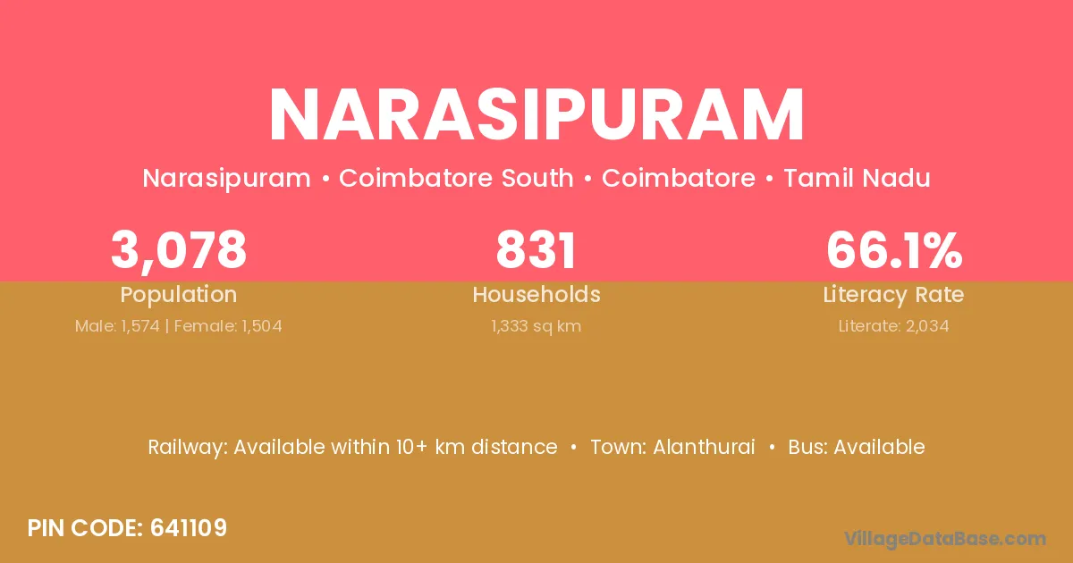 Narasipuram village has a total population of 3,078 people, of which 1,574 are males and 1,504 are females.