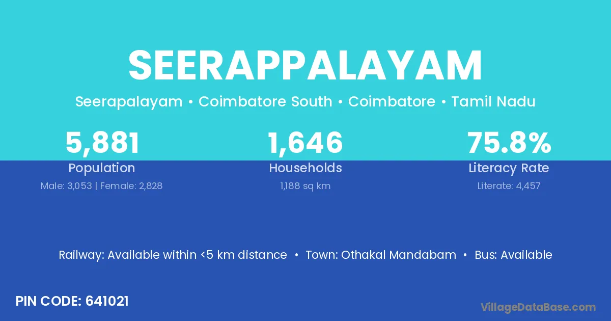 Seerappalayam village has a total population of 5,881 people, of which 3,053 are males and 2,828 are females.