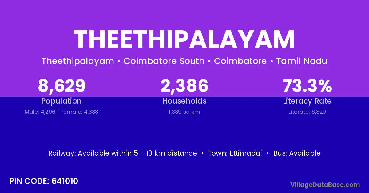 Theethipalayam village has a total population of 8,629 people, of which 4,296 are males and 4,333 are females.