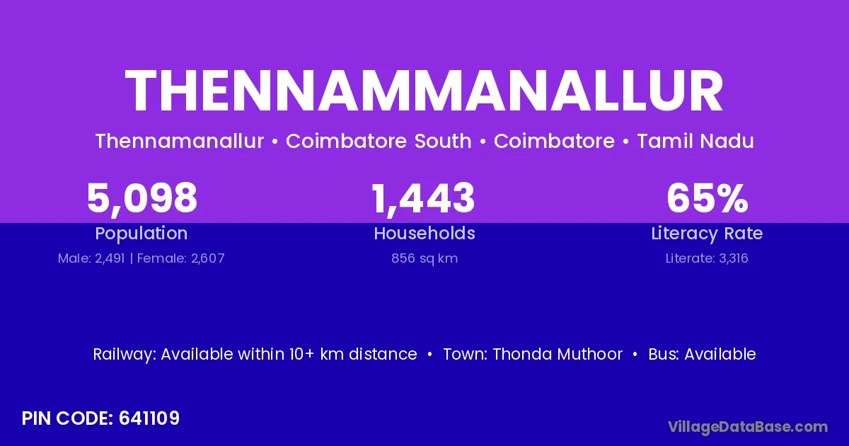 Thennammanallur village has a total population of 5,098 people, of which 2,491 are males and 2,607 are females.