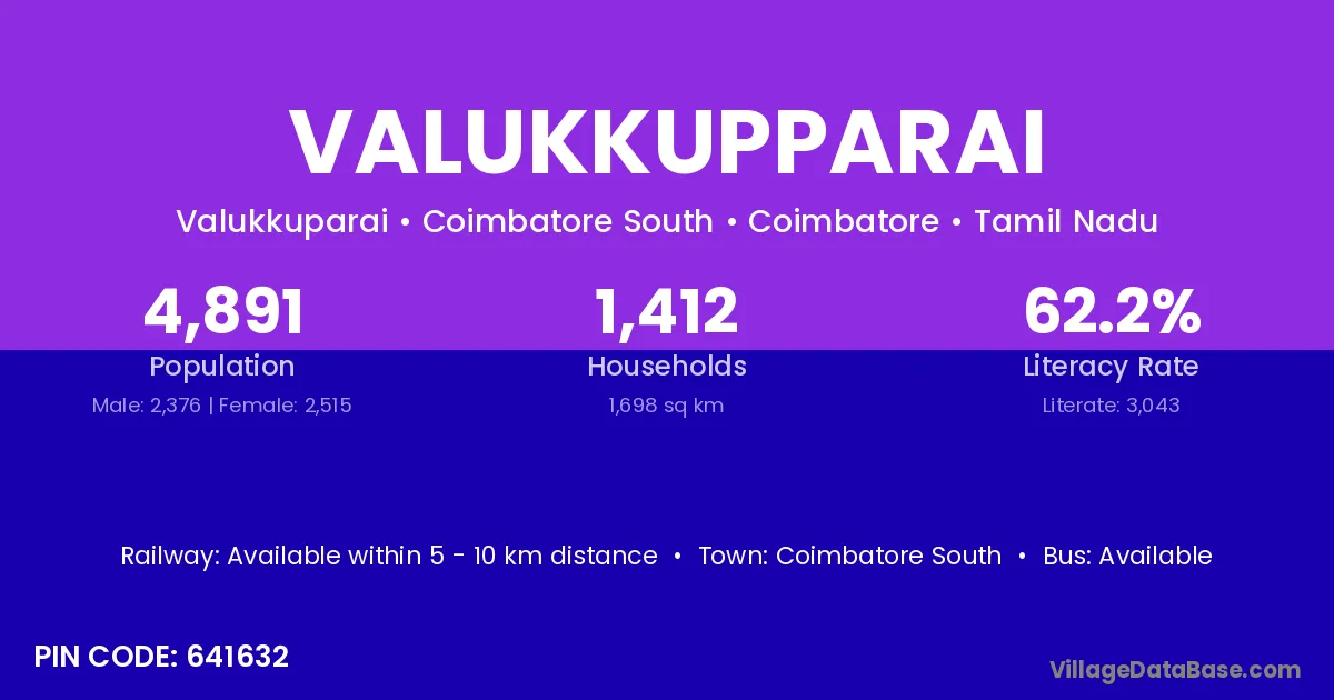 According to Census 2011 information, the village code of Valukkupparai village is 641632.