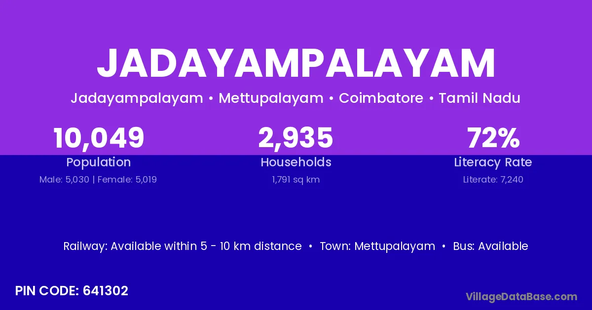 Mettupalayam is the nearest town to Jadayampalayam village for major economic activities