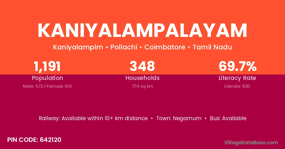 According to Census 2011 information, the village code of Kaniyalampalayam village is 642120.